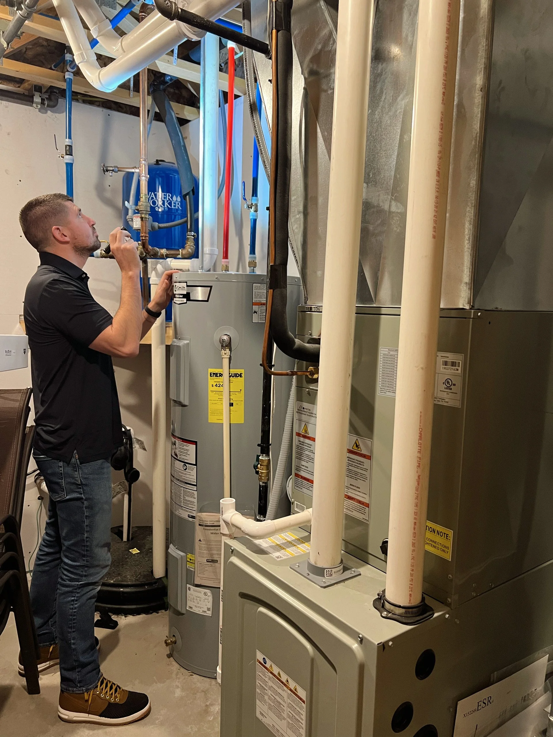 Plumbing checks, including sinks, toilets, water heater, and visible piping